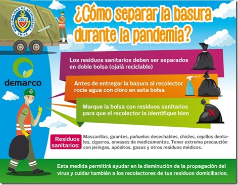 Finalmente cabe señalar que las recomendaciones más importantes son, separar los residuos sanitarios en doble bolsa (ojalá reciclable), antes de entregar la basura al recolector rociar agua con cloro en la bolsa y marcar la bolsa con residuos sanitarios para que el recolector la identifique bien.