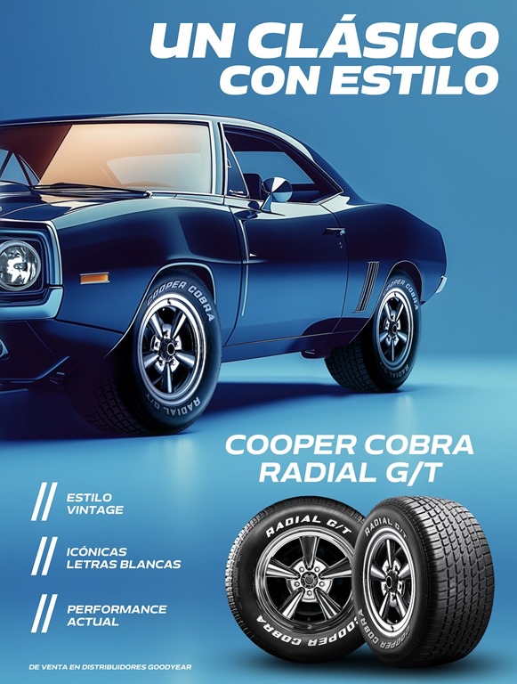 Fundada en 1914 y con más de un siglo de tradición, la marca estadounidense Cooper Tires busca ofrecer una calidad superior, excelente desempeño y una competitiva relación precio-calidad. Así nace el Cooper Cobra Radial G/T, neumático que se distingue por su diseño con letras blancas en el costado, una característica que evoca el espíritu de los muscle cars y vehículos icónicos de décadas pasadas, otorgando un sello de personalidad único. Entre sus principales atributos destacan: